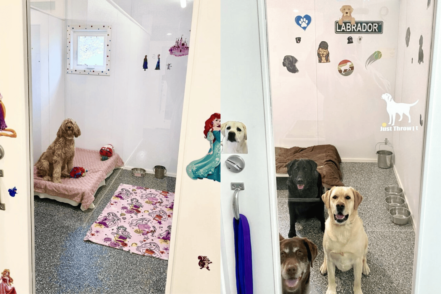 Three suite types are available-Deluxe, Patio and Family Suites. All include underfloor heating, AC, Kuranda elevated dog beds, sound systems, 24/7 security and ventilation control. Patio Suites feature a covered outdoor patio for fresh air, while Family Suites are the largest and ideal for bigger dogs.