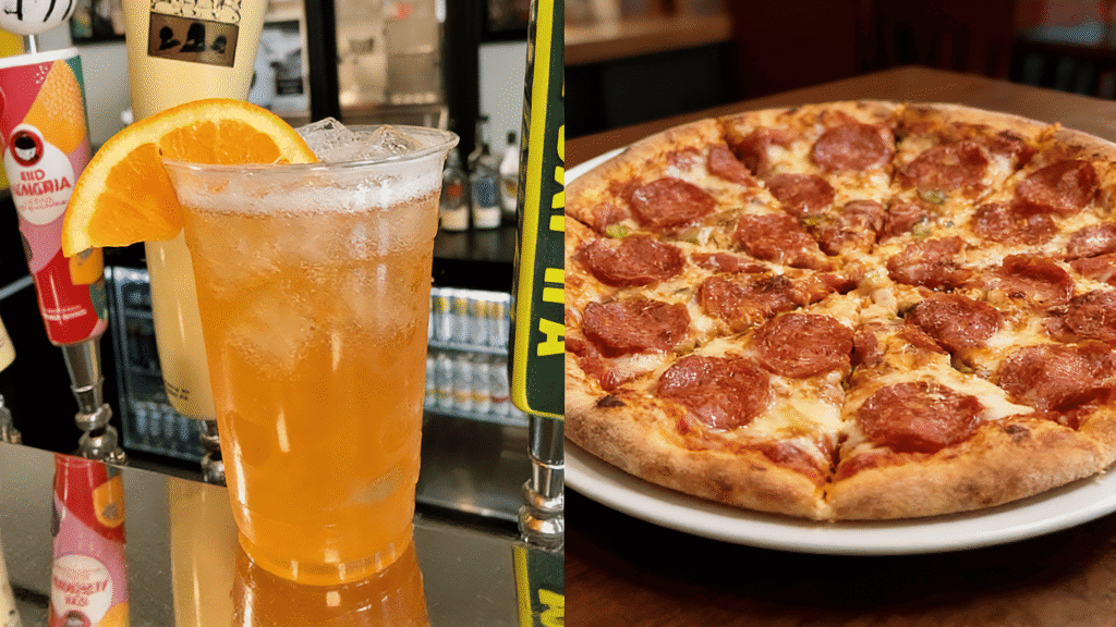 The menu includes snacks, artisan pan pizzas, signature wings, hand-tossed pizzas, and $5 dog-themed kids’ meals for children under 10. Drinks cover soft drinks, craft beers, cider, sangria, and $8–$10 signature cocktails such as Georgia Peach and Orange Crush—ideal for dining with your furry friend.